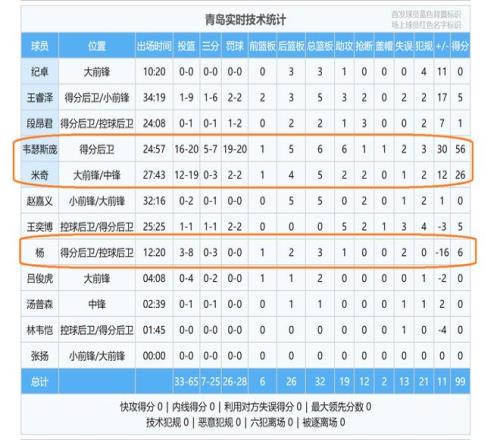 为何会这样说呢?原因也是十分简单,那就是青岛队三名外援得分加起来达到了88分,韦瑟斯庞轰出了56分,米奇得了26分,约瑟夫·杨则拿了6分,占据了青岛队总得分的89%,青岛队8名本土球员总得分只有11分,其中,3个人有得分进账,分别是王睿泽得了5分,王奕博得了5分, 段昂君得了1分。