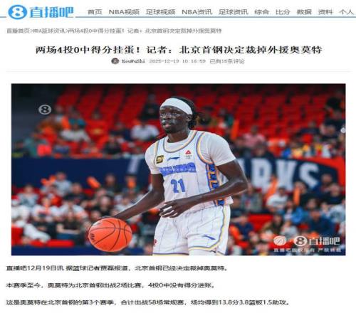直播吧:两场4投0中得分挂蛋!记者:北京首钢决定裁掉外援奥莫特